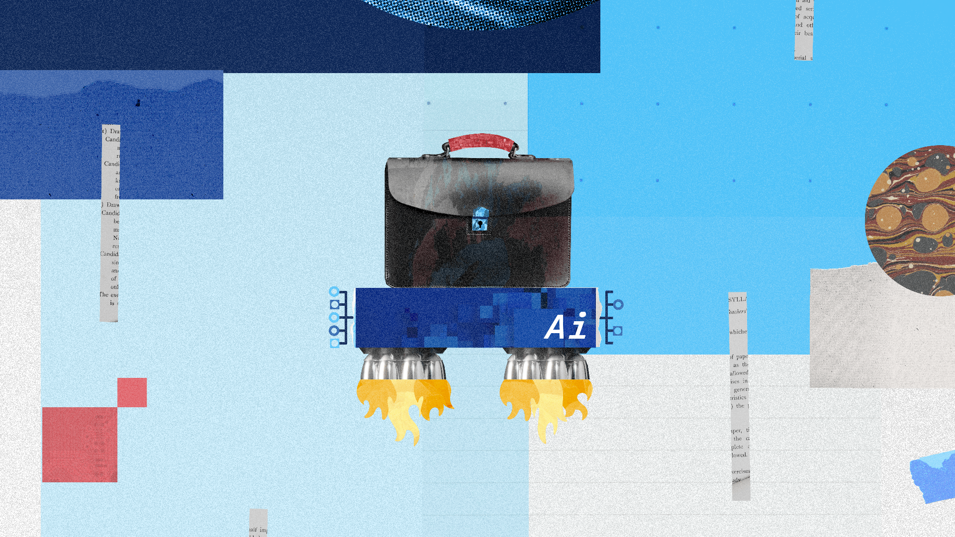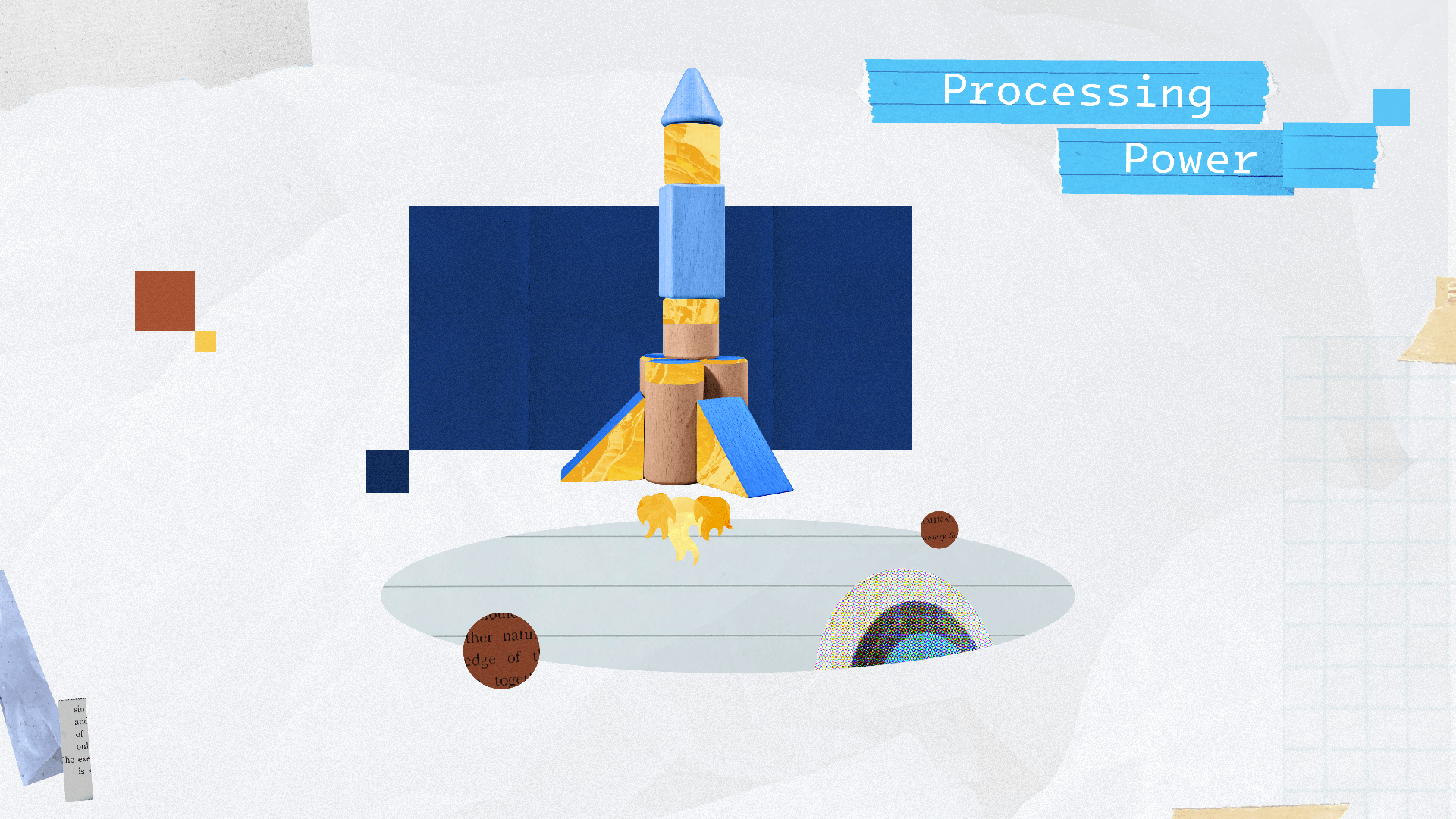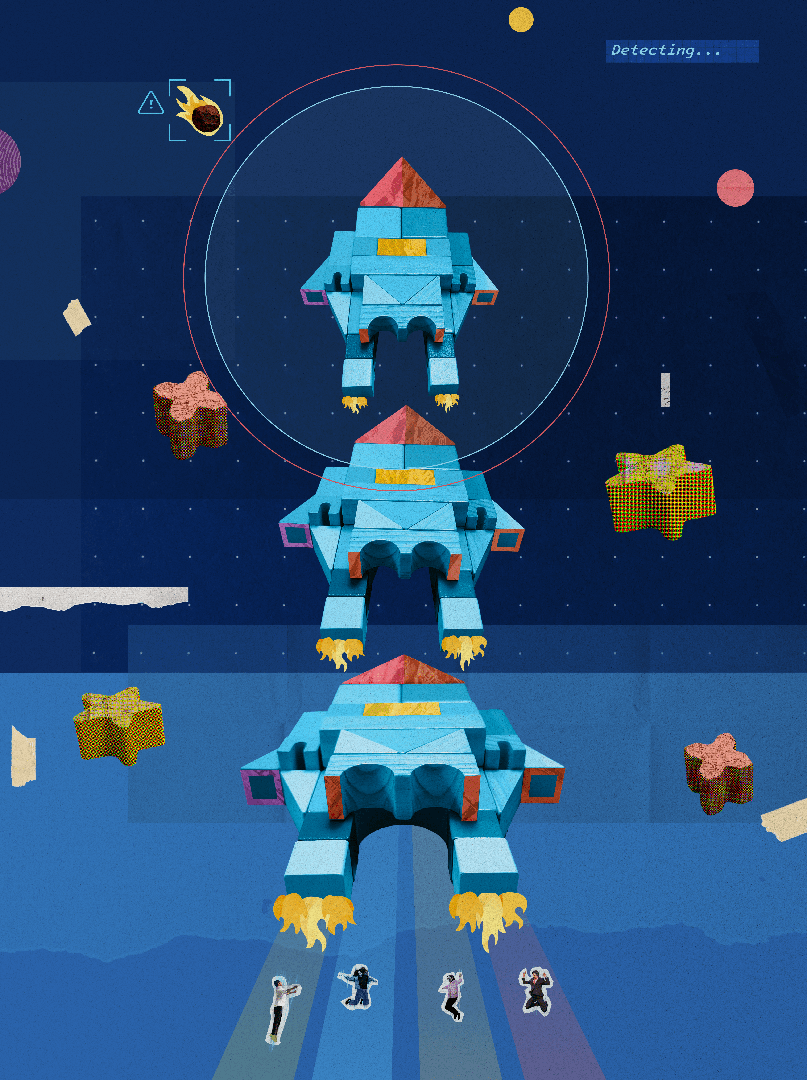 Creating the style: After experimenting with a number of visual directions, we agreed on a collage approach in line with the Wall Street Journal’s signature style. In creating the style we used a mixture of stock images and textures, and hand created elements, such as the building block spaceships – created from my son’s blocks and photographed by myself! Another easter egg is that some of the hands though out are in fact also mine!
